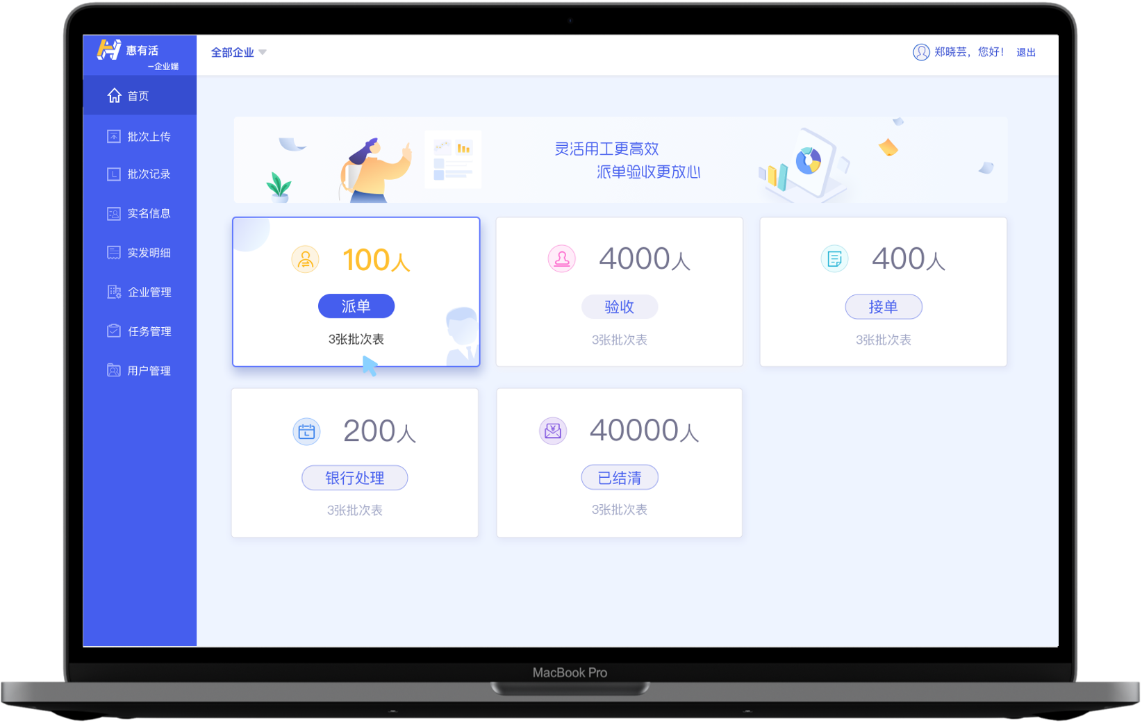 “惠有活”是位来小猎自主研发的灵活用工系统,以提升发包方的执行效率为核心,利用数据穿透,银企直联,结合主流安全风控策略,实现数据流、业务流、资金流实时同步、可追溯。